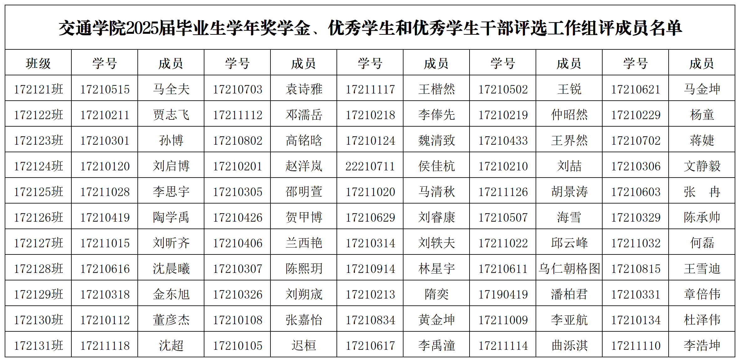 根据党委学生工作部《关于开展2025届毕业生学年奖学金、优秀学生和优秀学生干部评选工作的通知》相关要求,av国产 按照班级为单位成立组评小组(小组成员一般由学生党员、学生干部、学生代表组成,总人数不少于5人,其中设组长1人)。现将2025届毕业生学年奖学金、优秀学生和优秀学生干部评选工作组评小组成员名单公布如下(各组评小组首位为组长)。
