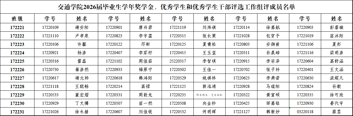 根据党委学生工作部《关于开展2026届毕业生学年奖学金、优秀学生和优秀学生干部评选工作的通知》相关要求,av国产 按照班级为单位成立组评小组(小组成员一般由学生党员、学生干部、学生代表组成,总人数不少于5人,其中设组长1人)。现将2026届毕业生学年奖学金、优秀学生和优秀学生干部评选工作组评小组成员名单公布如下(各组评小组首位为组长)。
